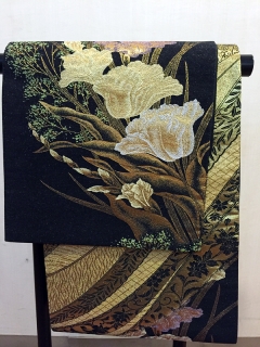 長さ:453cm お太鼓と前柄の柄が違う大変珍しい帯です。 黒字に金と紫の洋花と大変幻想的な柄となっております